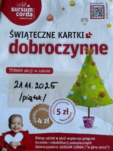 W najbliższy piątek, tj. 21 listopada, po raz kolejny w naszej szkole zostanie przeprowadzona akcja sprzedaży świątecznych kartek Stowarzyszenia Sursum Corda. Cena kartki wraz z kopertą wynosi 5 złotych. Dodatkowo istnieje możliwość zakupu sianka wigilijnego w cenie 4 złotych. Zachęcamy wszystkich do udziału w akcji