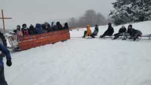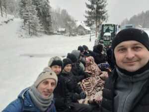 Po kuligu uczestnicy ogrzali się przy ognisku, gdzie nie mogło zabraknąć pieczonej kiełbasy, wspólnych rozmów i dobrej zabawy. Wyjazd był doskonałą okazją do integracji oraz aktywnego spędzenia czasu na świeżym powietrzu.